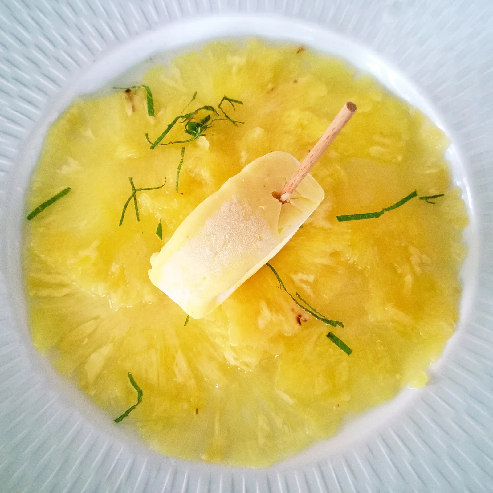 Si ce plat n’était peut-être pas le plus goûteux du voyage, il en constituait l’une des plus belles surprises. Création du chef Guy Lassausaie, cette entrée consiste en un velouté de courgettes servi froid à la manière d’une gaspacho, rehaussé de petits morceaux de légumes du sud au vinaigre de citron, et couronné par un œuf poché tiède au jaune bien coulant. Dans la même veine rafraîchissante, nous avons eu pour dessert un carpaccio d’ananas à la verveine, surmonté d’un esquimau au citron.