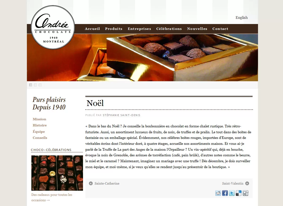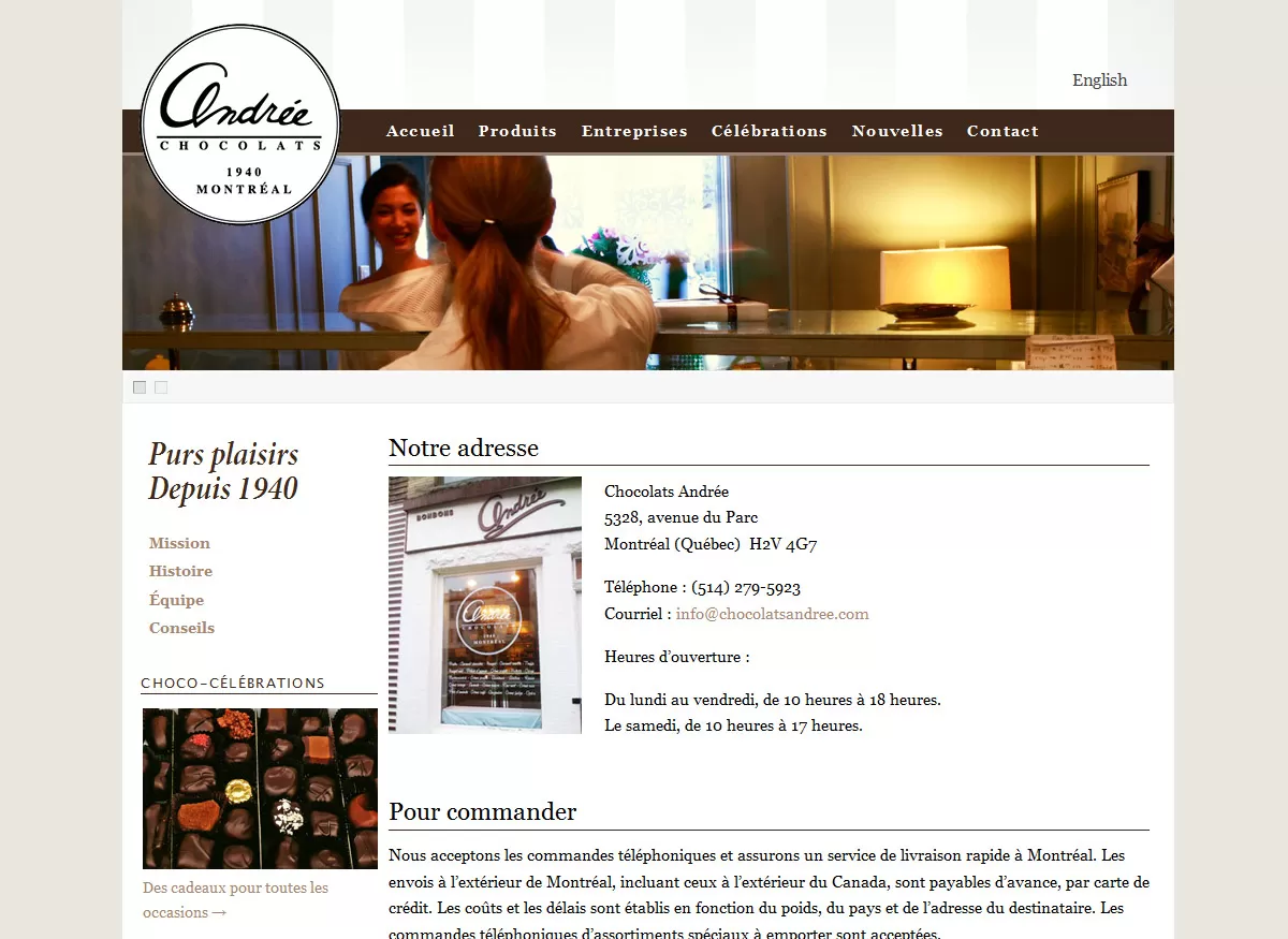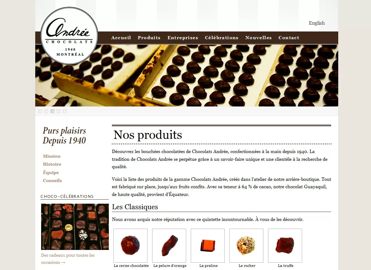 Véritable institution du quartier Mile-End à Montréal, Chocolats Andrée est en activité depuis 1940. La conception du tout premier site web de ce commerce s'inscrivait dans un mandat de relations publiques assuré par Yann Fortier. L'utilisation de WordPress et de NextGen Gallery a permis de mettre en valeur la fabrication artisanale des chocolats tout en respectant les contraintes budgétaires.