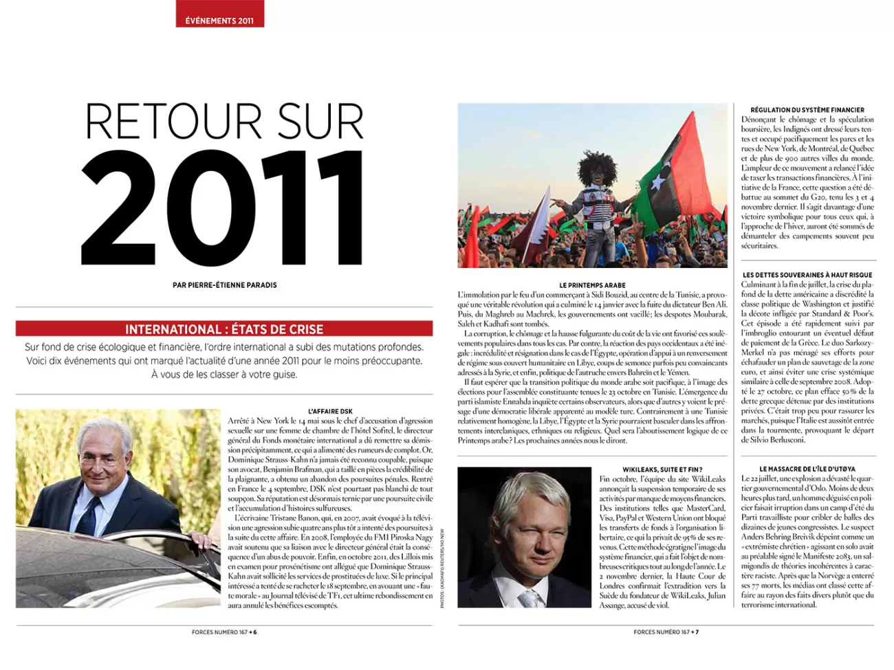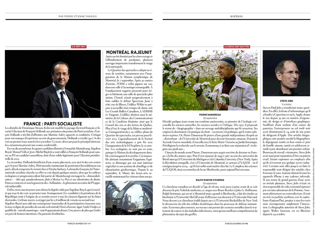 Rédaction pour le magazine trimestriel Forces. Brefs comptes-rendus de l'actualité économique, politique et sociale au Québec, au Canada et à l'étranger. Biographies de personnes influentes récemment disparues.